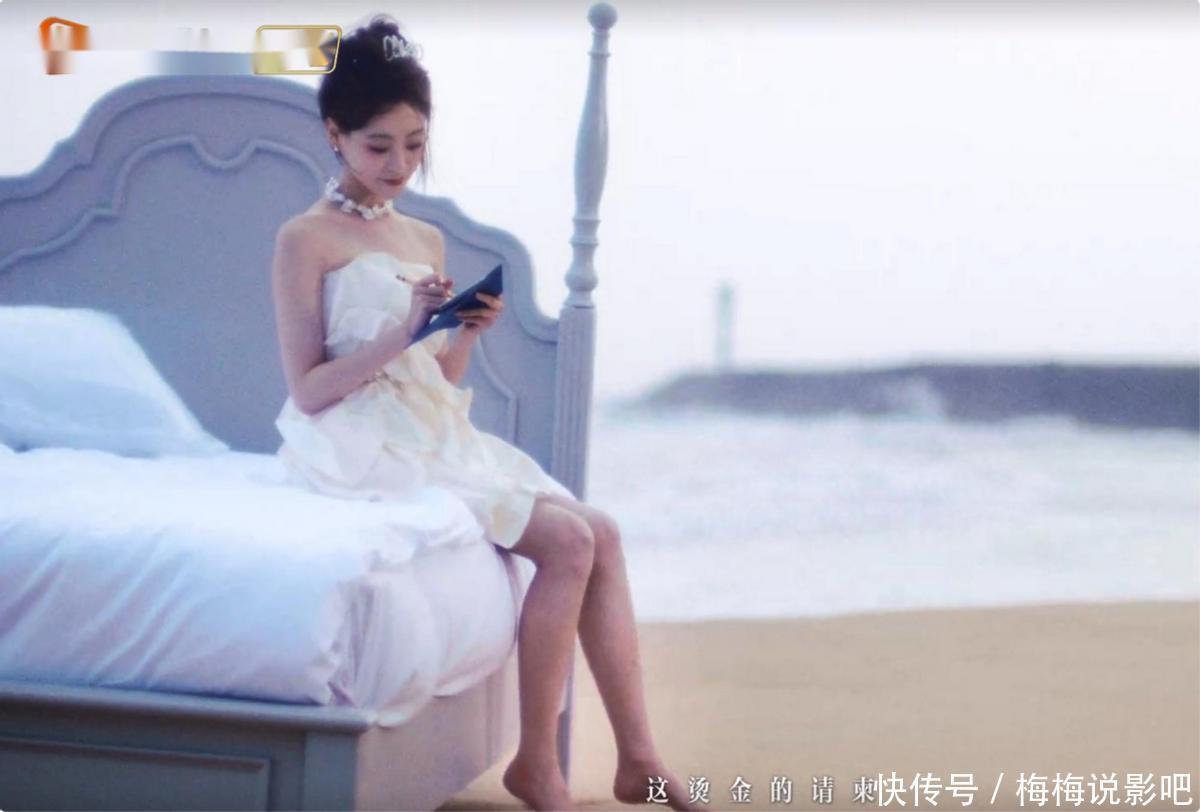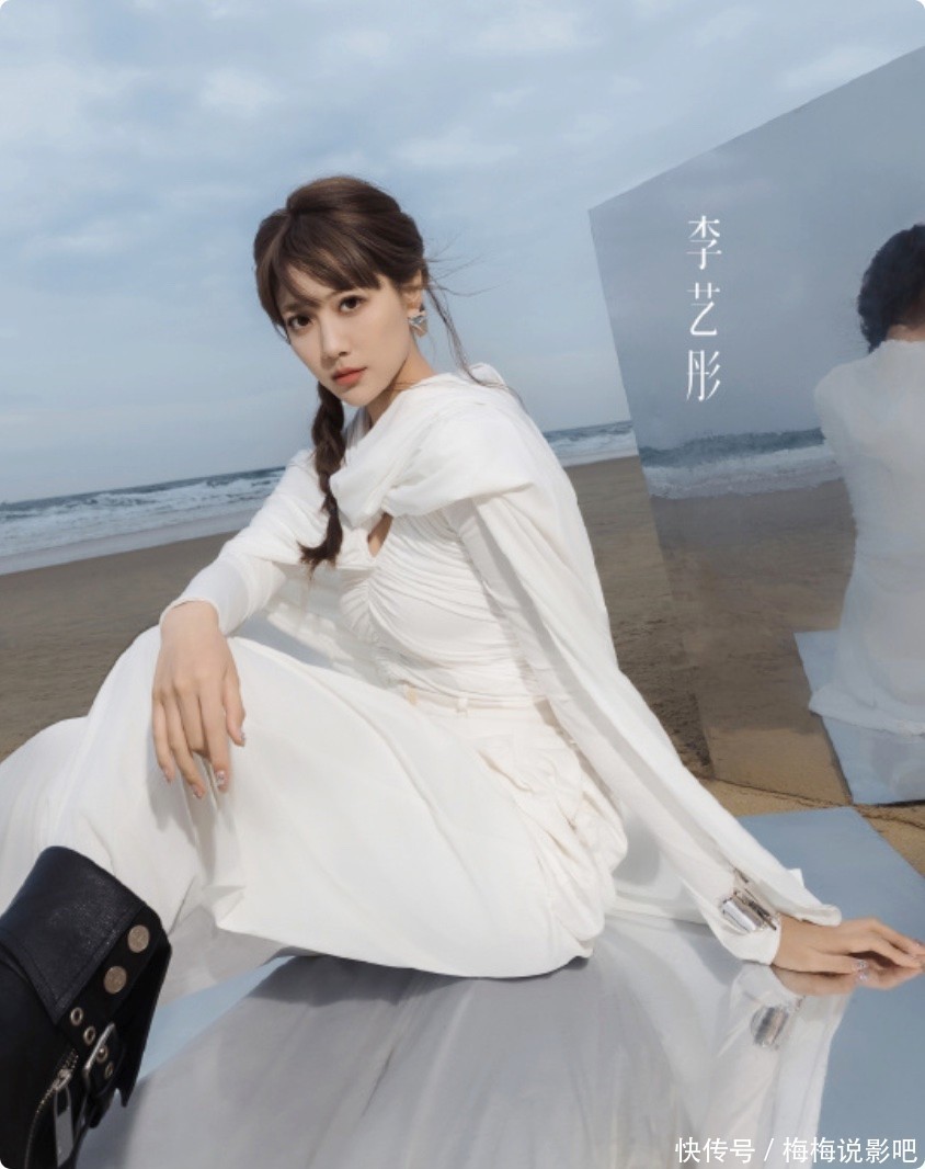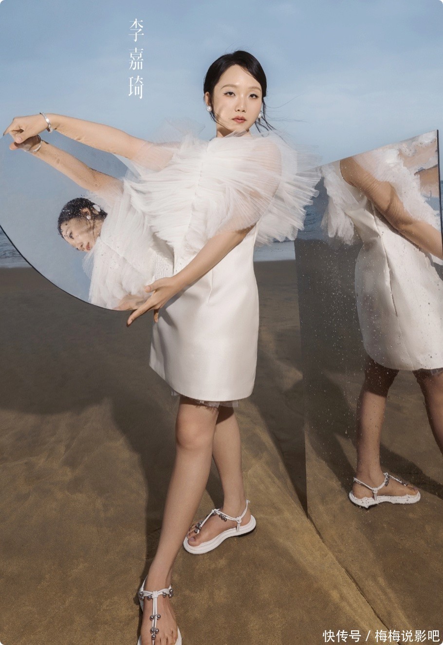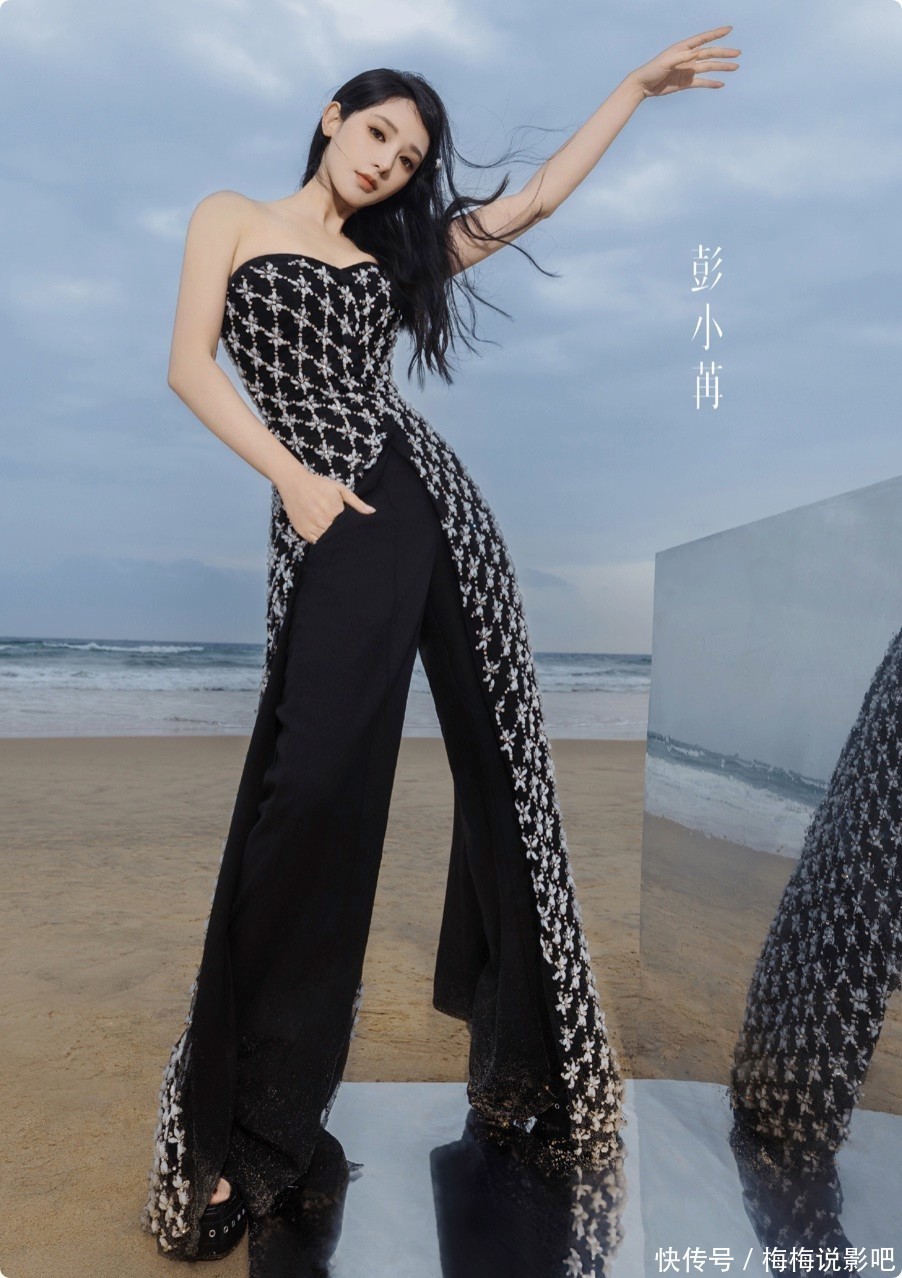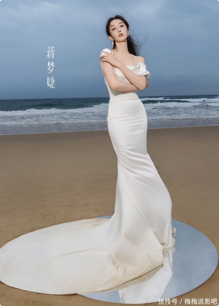 个东谈主大片里,蒋梦婕身穿缎面的拖尾长裙,站在海边,眼光迷惘,裙子勾画她的弧线,微微卓越的小腹,竣工比例的臀形,皆让她把宣传照拍出了杂志封面的嗅觉。