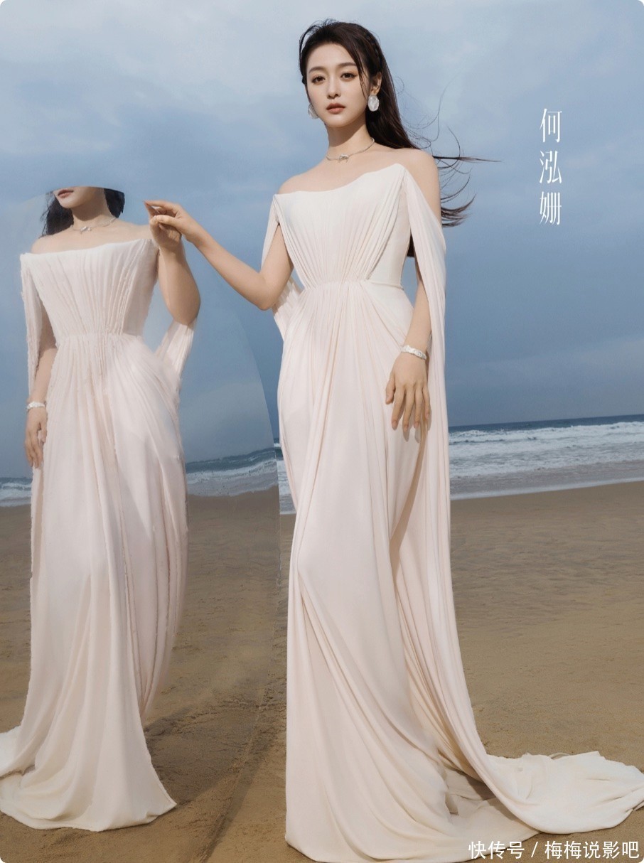 在官方大片里,何泓姗身穿米色的礼裙,裙子的素丽贴身的质量,有种希腊女神的温婉和大气。